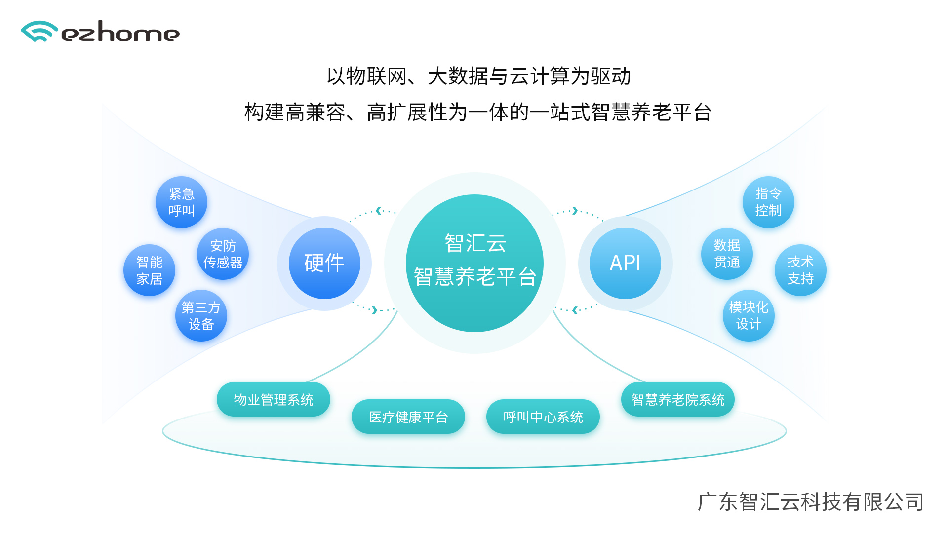 智匯云智慧養(yǎng)老平臺以物聯(lián)網(wǎng)、大數(shù)據(jù)與云計算為技術(shù)底座,構(gòu)建了高兼容、高擴展性的一站式服務(wù)體系。