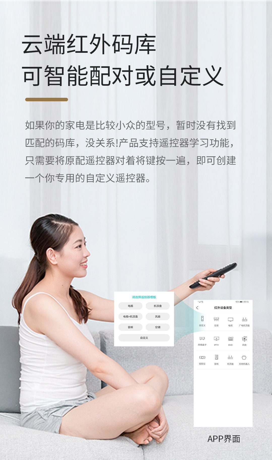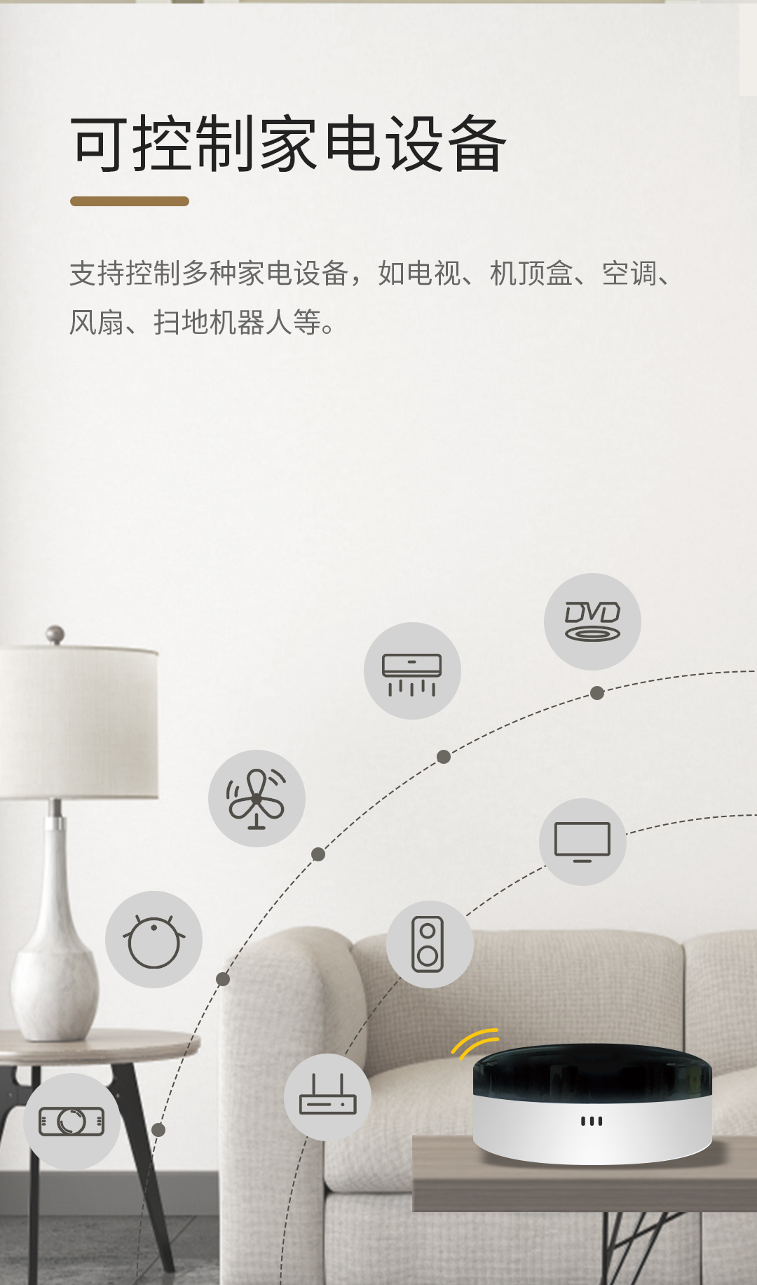 隨時(shí)隨地控制家中所有紅外類設(shè)備家電,像空調(diào)(中央空調(diào)暫時(shí)不支持),電視等家電。
