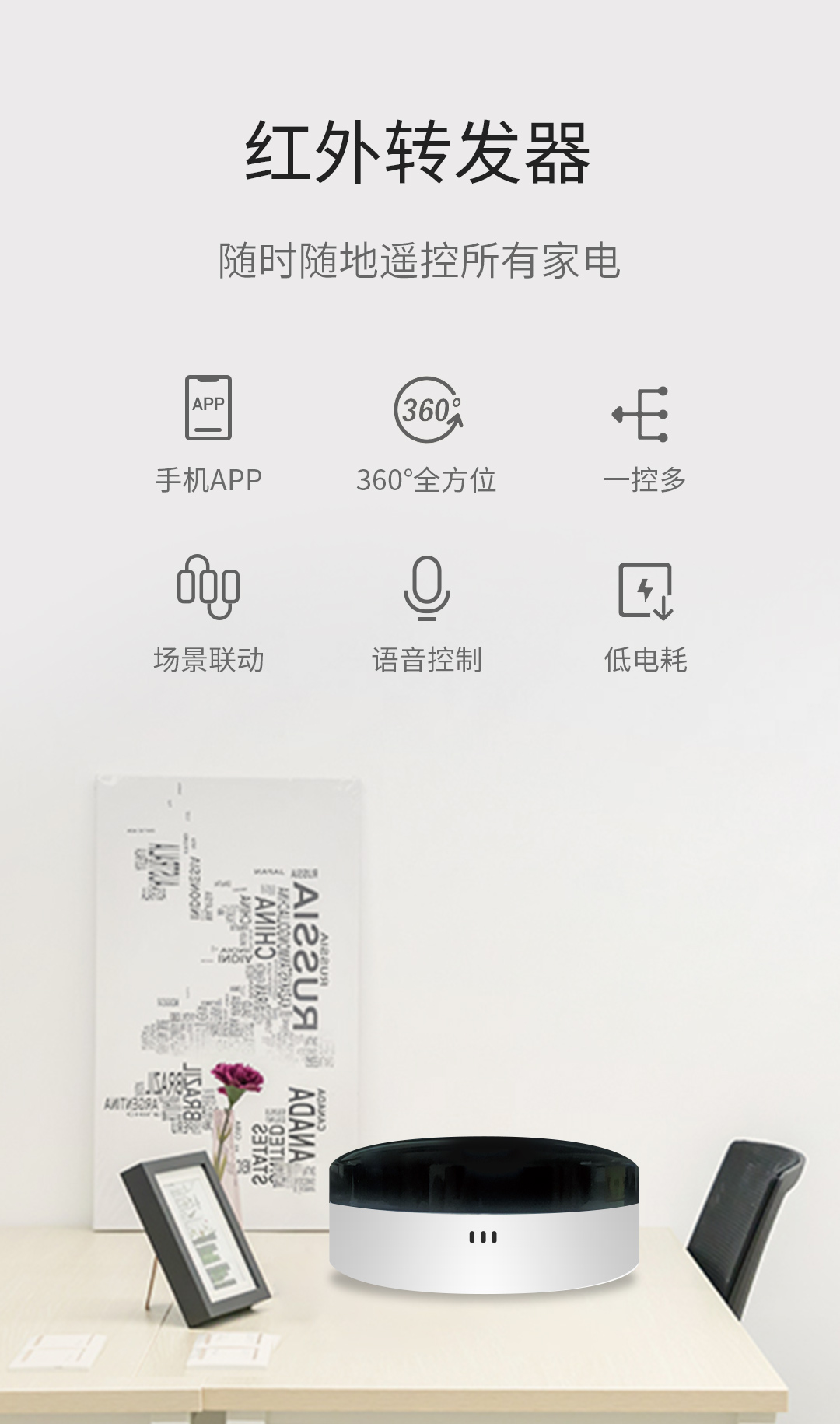 不需任何設(shè)備,只需要一個(gè)紅外轉(zhuǎn)化器即可實(shí)現(xiàn)家電控制,外出路上,能提前用手機(jī)APP打開(kāi)家中空調(diào),也可以支持語(yǔ)音,遙控控制。