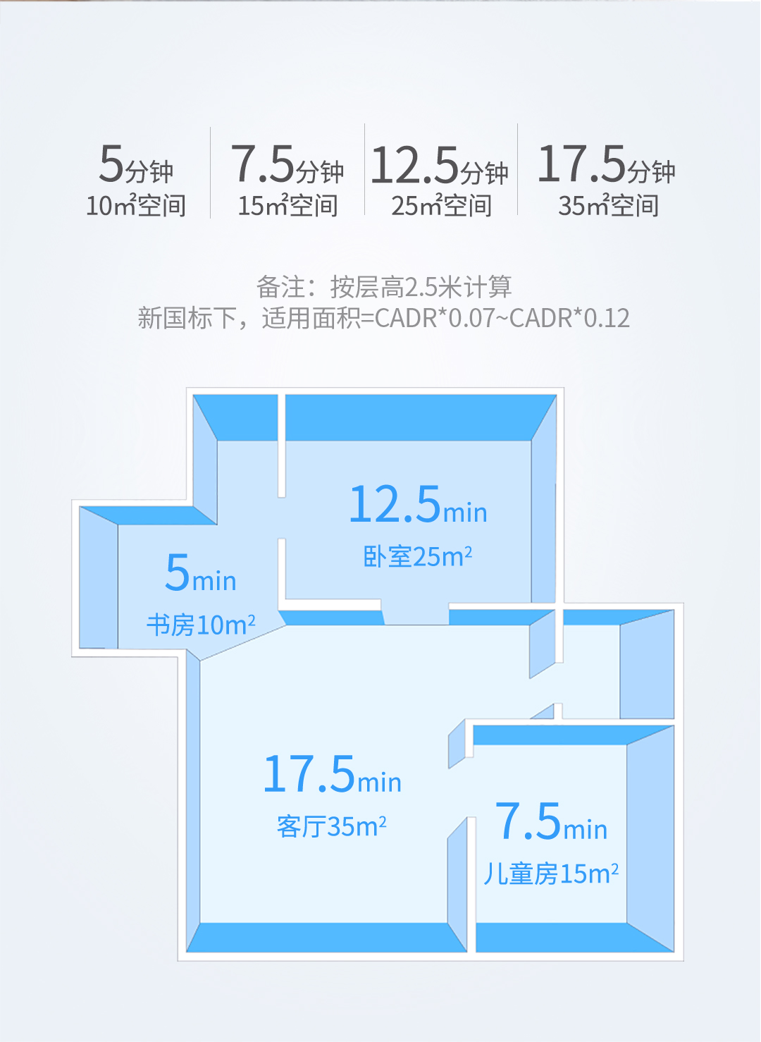 凈化能效的提示,使凈化35㎡的房間1次僅需17.5分鐘,能滿足更大面積的循環(huán)凈化。