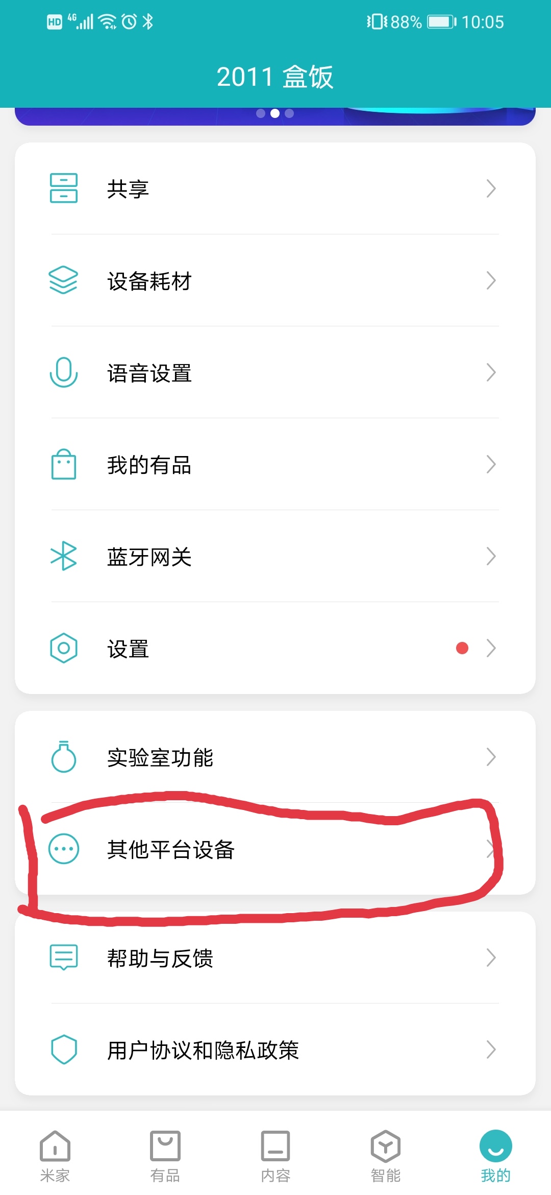 1、 打開“米家”APP,點擊下方“我的”欄,點擊“其他平臺設(shè)備”;
