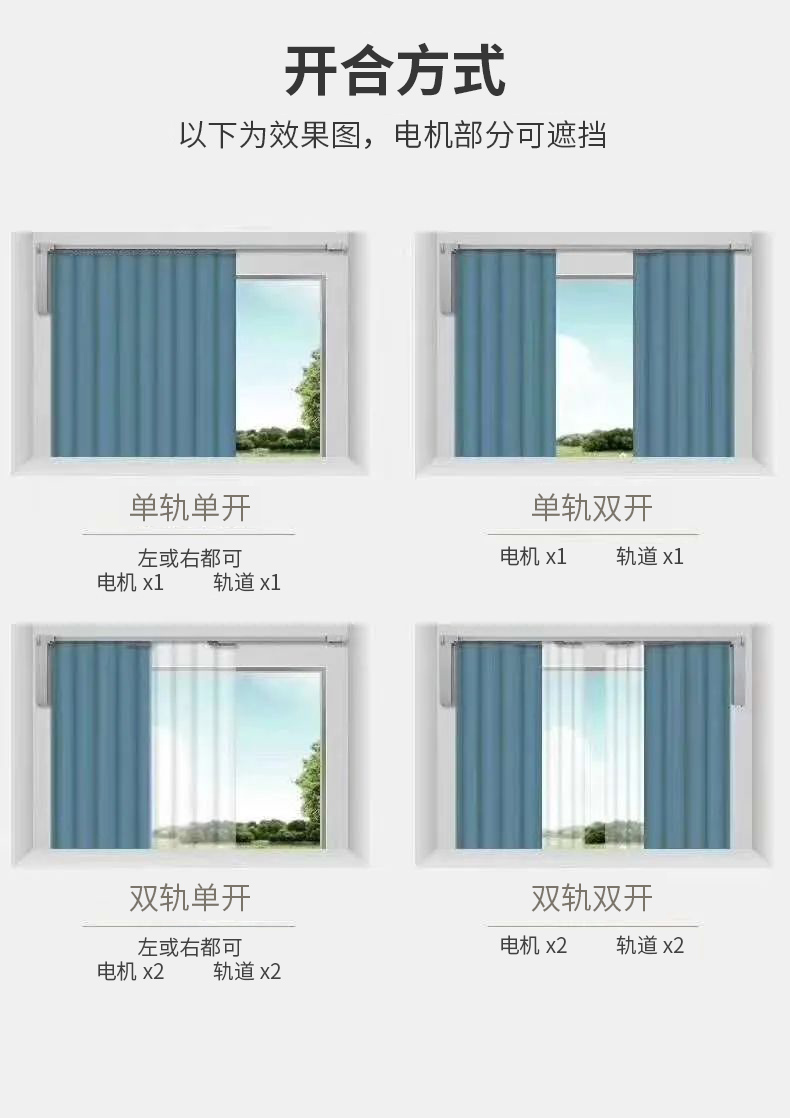 需要注意的是,安裝單層窗簾只需安裝1個電機,1條軌道;而安裝雙層窗簾(一層布簾+一層紗簾),則需安裝2個電機,2條軌道。