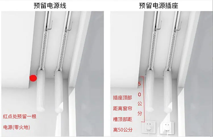 (5)安裝需要預留至少一個電源插頭,插座頂部需距離窗簾槽頂部50CM