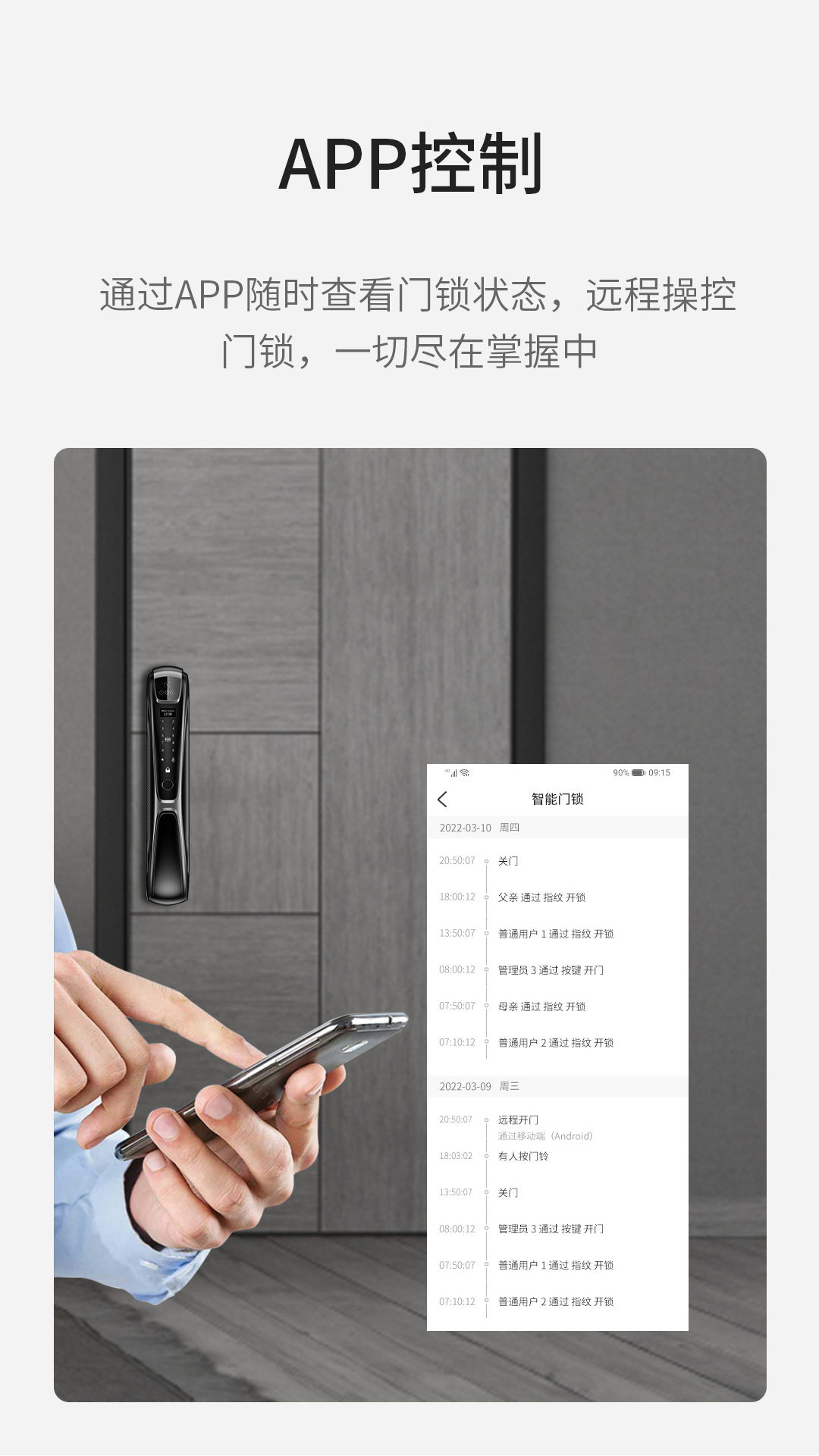 在眾多解鎖方式中,遠程開鎖功能十分獨特。無論用戶身處何地,均可通過智能家居管家APP,遠程控制門鎖的閉合,隨時隨地查看門鎖狀態(tài),人性化的功能設計讓用戶更具安全感,出門再無后顧之憂。