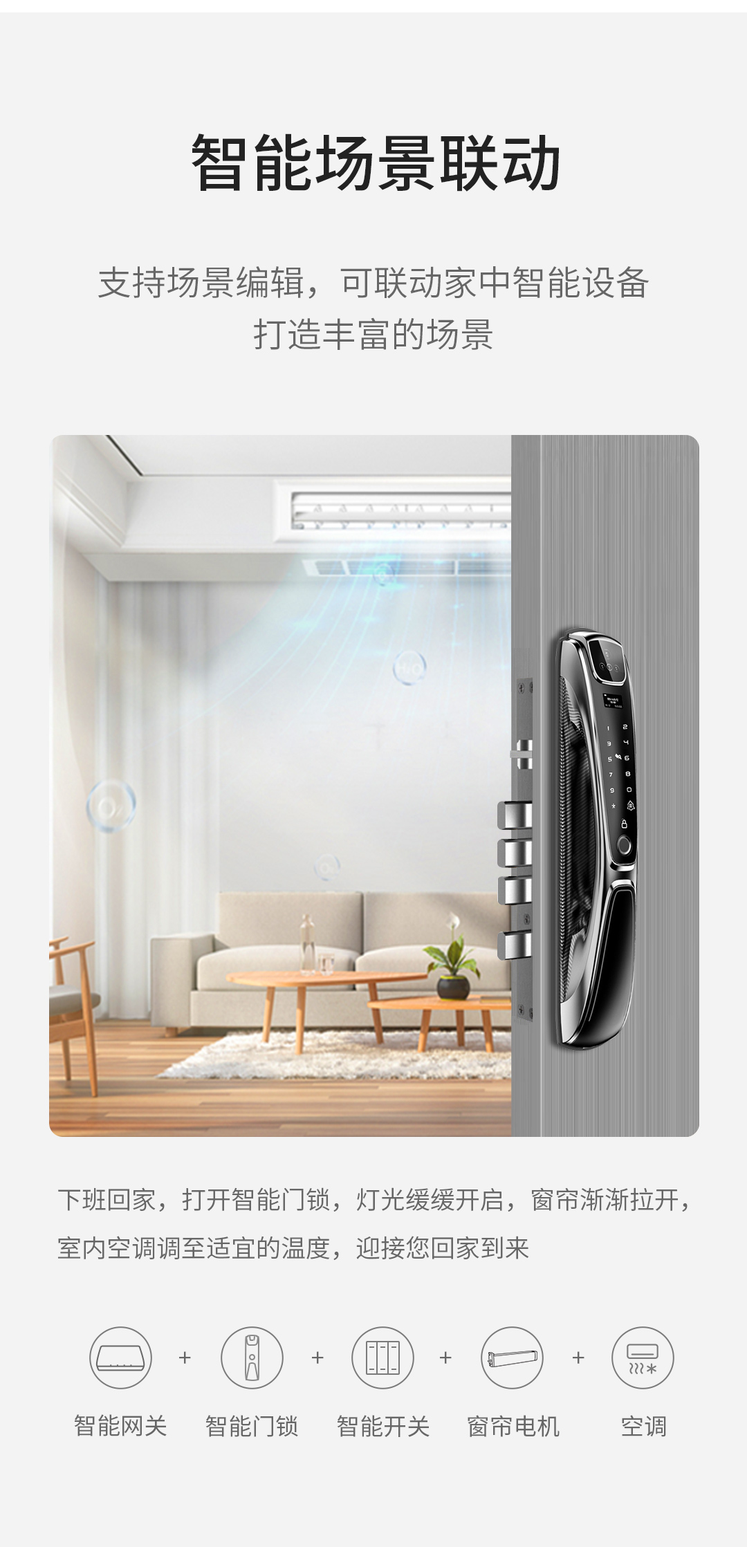 智匯云智能門鎖,還能聯動家中智能設備打造豐富場景。設置場景時,還可添加“任意門鎖用戶的開門動作”作為觸發(fā)條件。當該用戶打開門鎖后,即可實現設置好的智能場景,比如回家場景。