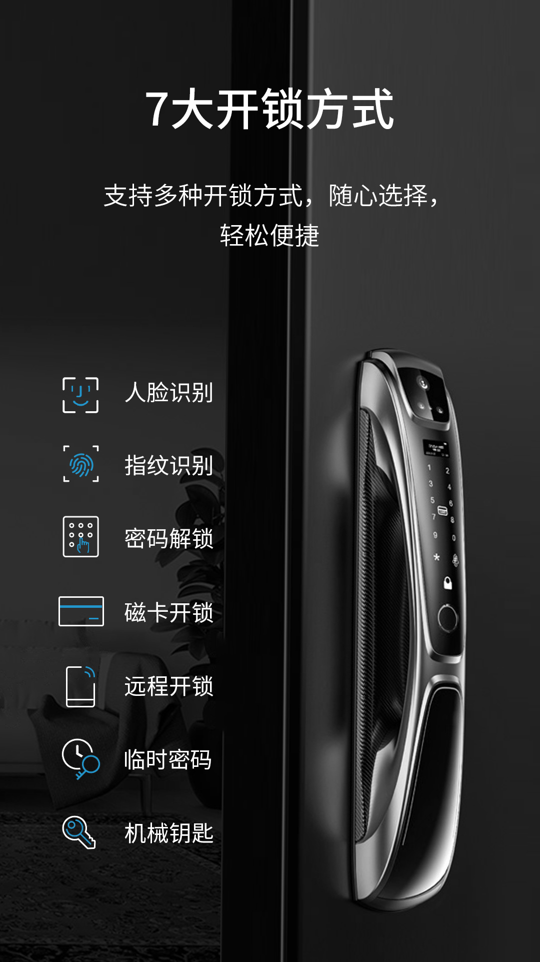 除了人臉識別開鎖,智匯云智能門鎖還支持指紋、密碼、刷卡、遠程、臨時密碼、鑰匙開鎖等豐富的開鎖方式,用戶可隨心選擇。