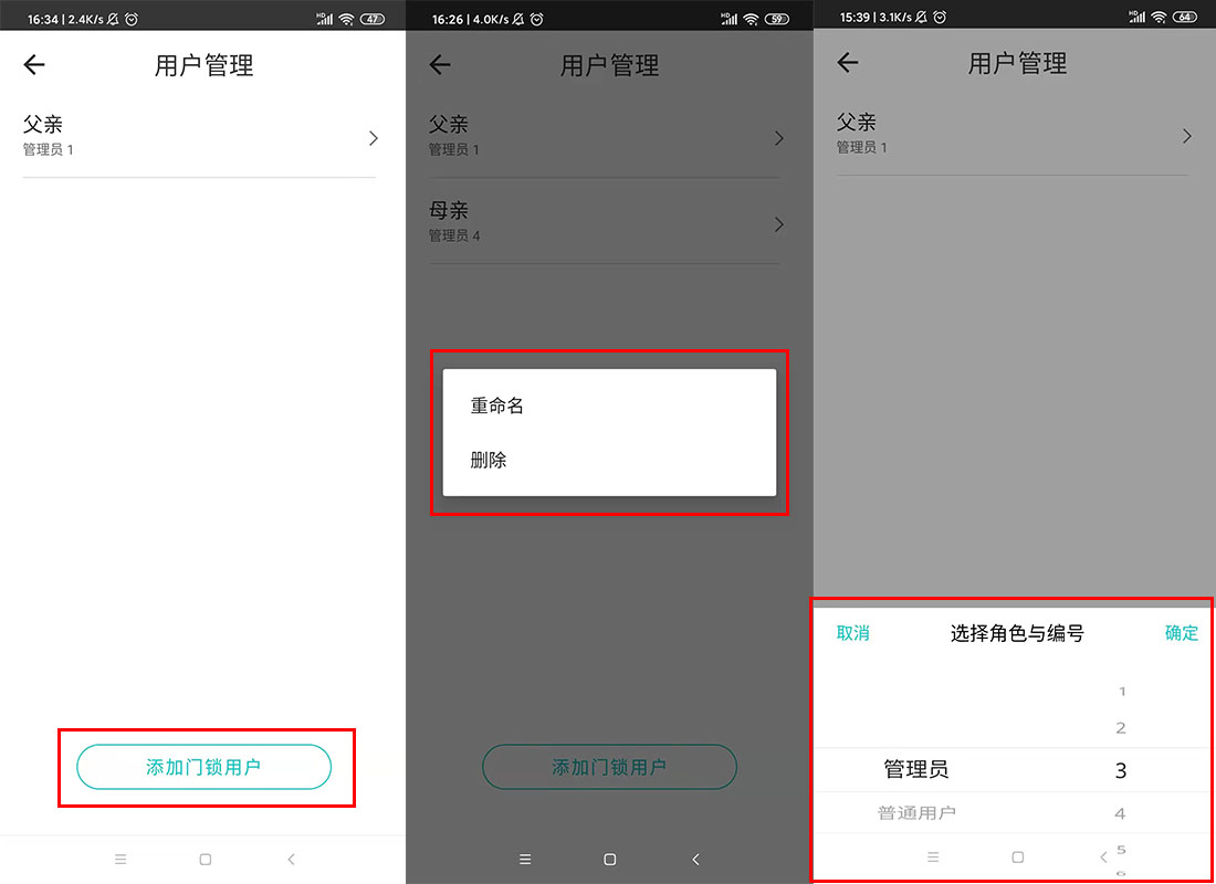 通過手機APP,我們還可以管理門鎖用戶,包括添加、刪除和重命名用戶,以及設置用戶管理權限。比如添加用戶“父親”后,當“父親”開啟門鎖,將立刻推送開鎖信息至手機。