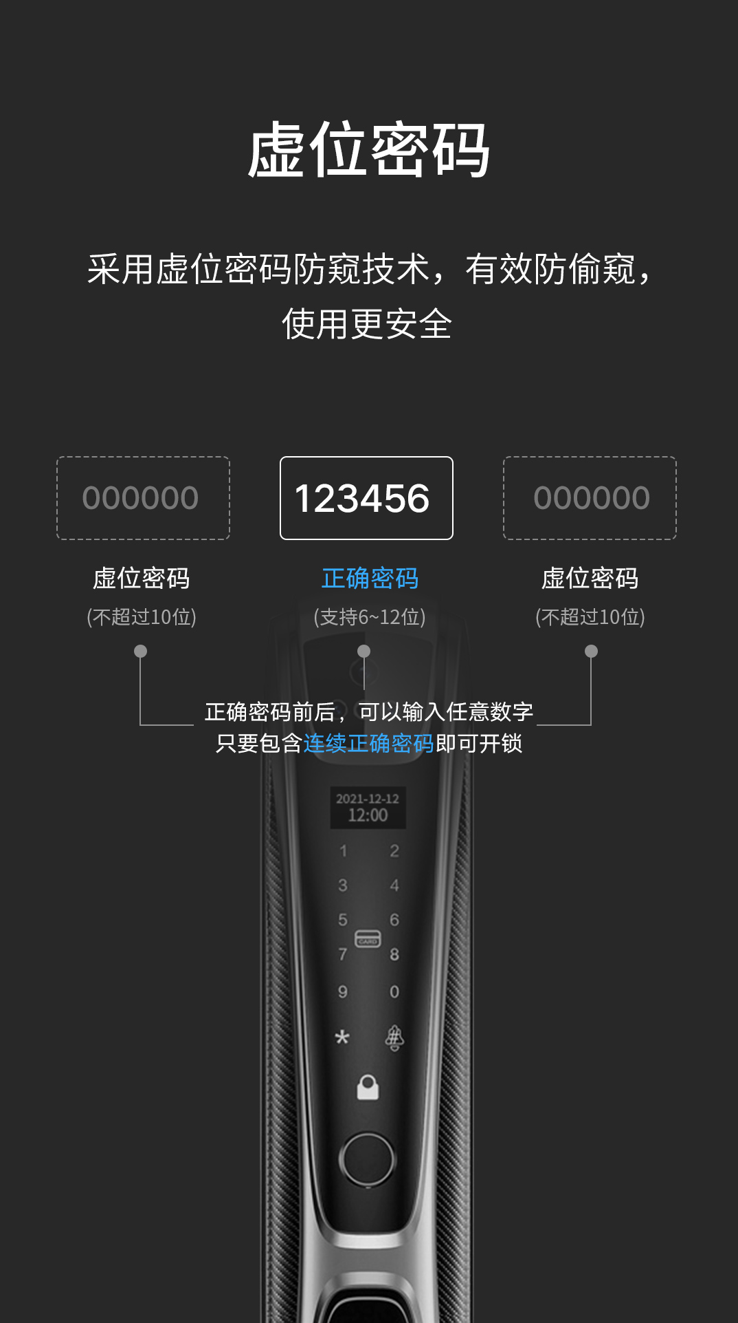 密碼開鎖使用的虛位密碼智能防窺技術,是指在輸入正確密碼的前后,任意輸入幾個數字,使他人難辨真實密碼。即使在他人面前也能大膽輸入密碼,有效保障密碼信息的安全。