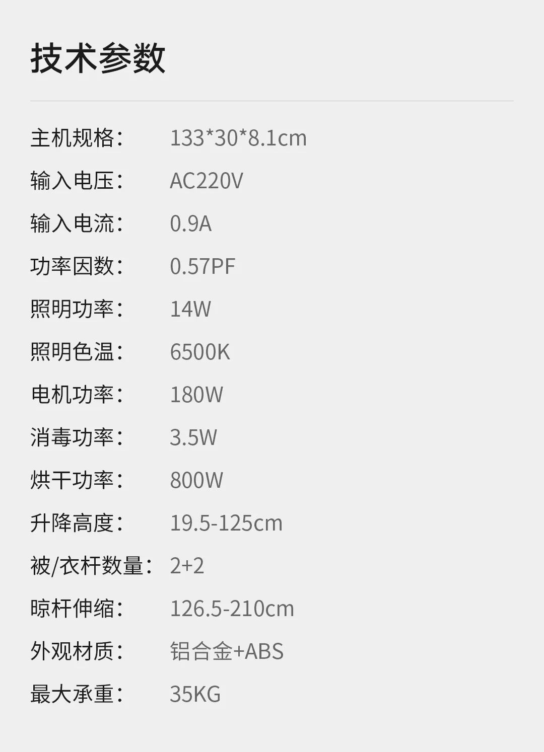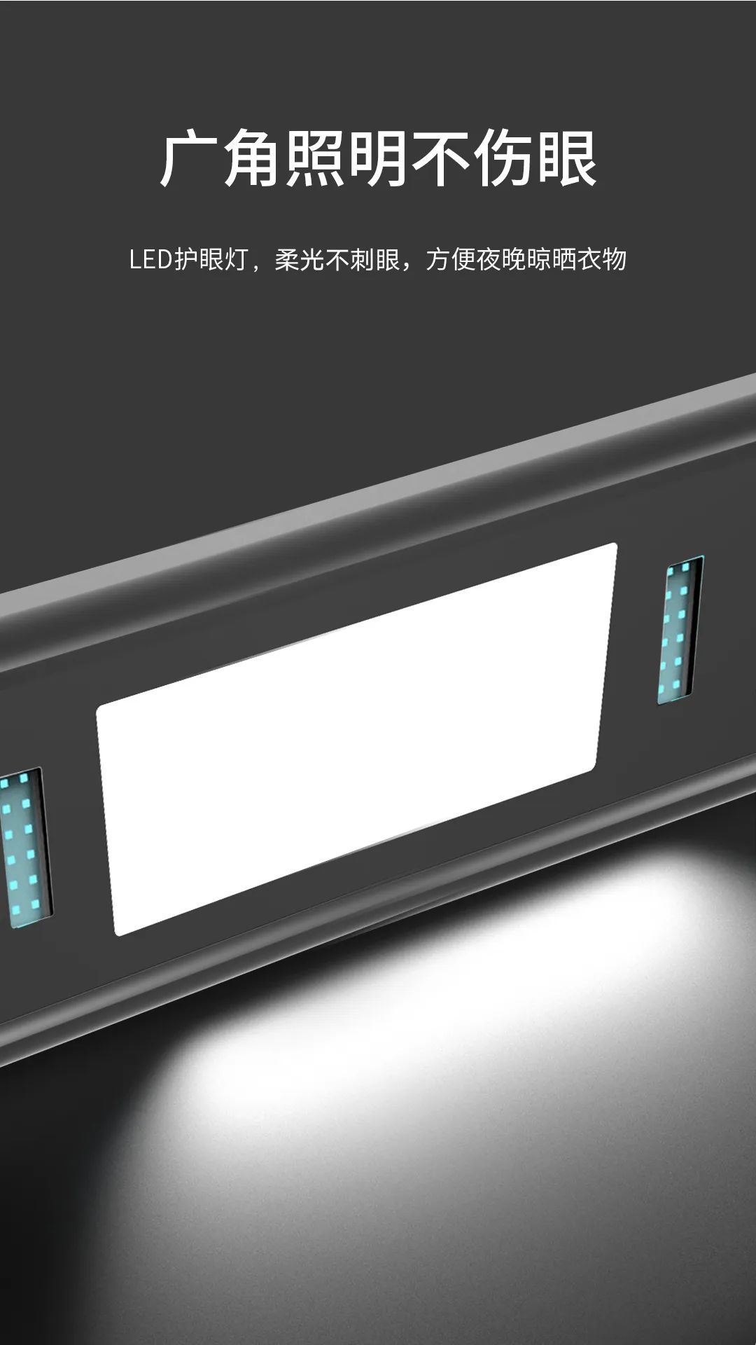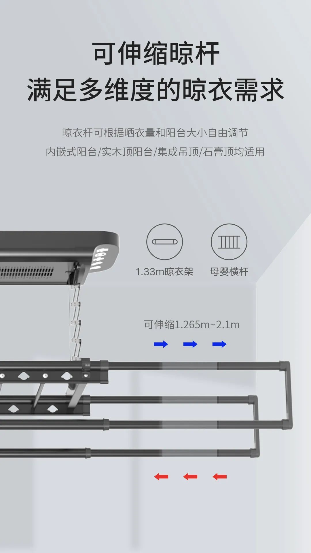 超薄機(jī)身配備了126.5到210cm伸縮晾衣桿,可以根據(jù)實(shí)際晾曬量對(duì)晾衣桿長(zhǎng)短進(jìn)行調(diào)整。可伸縮晾衣桿設(shè)計(jì),四個(gè)可伸縮方向,全方位打開(kāi),晾曬被子床單床品時(shí)采用超長(zhǎng)晾衣桿,支撐起全家的晾曬重任。