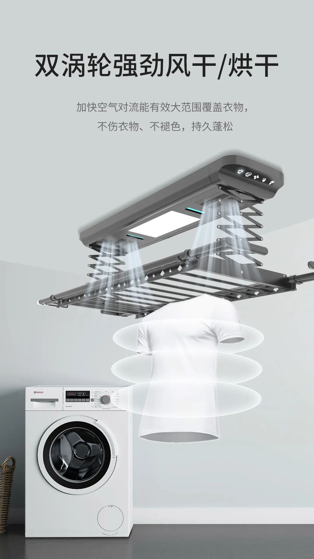 內(nèi)芯采用高效低噪穩(wěn)定智能電機(jī),運(yùn)用開(kāi)關(guān)電源驅(qū)動(dòng)技術(shù),使晾衣可長(zhǎng)時(shí)間多頻次升降,平滑運(yùn)行,節(jié)能降噪,靜音舒適,智能烘干衣物,雙渦輪強(qiáng)勁風(fēng)干/烘干,不傷衣物、不褪色,持久蓬松。