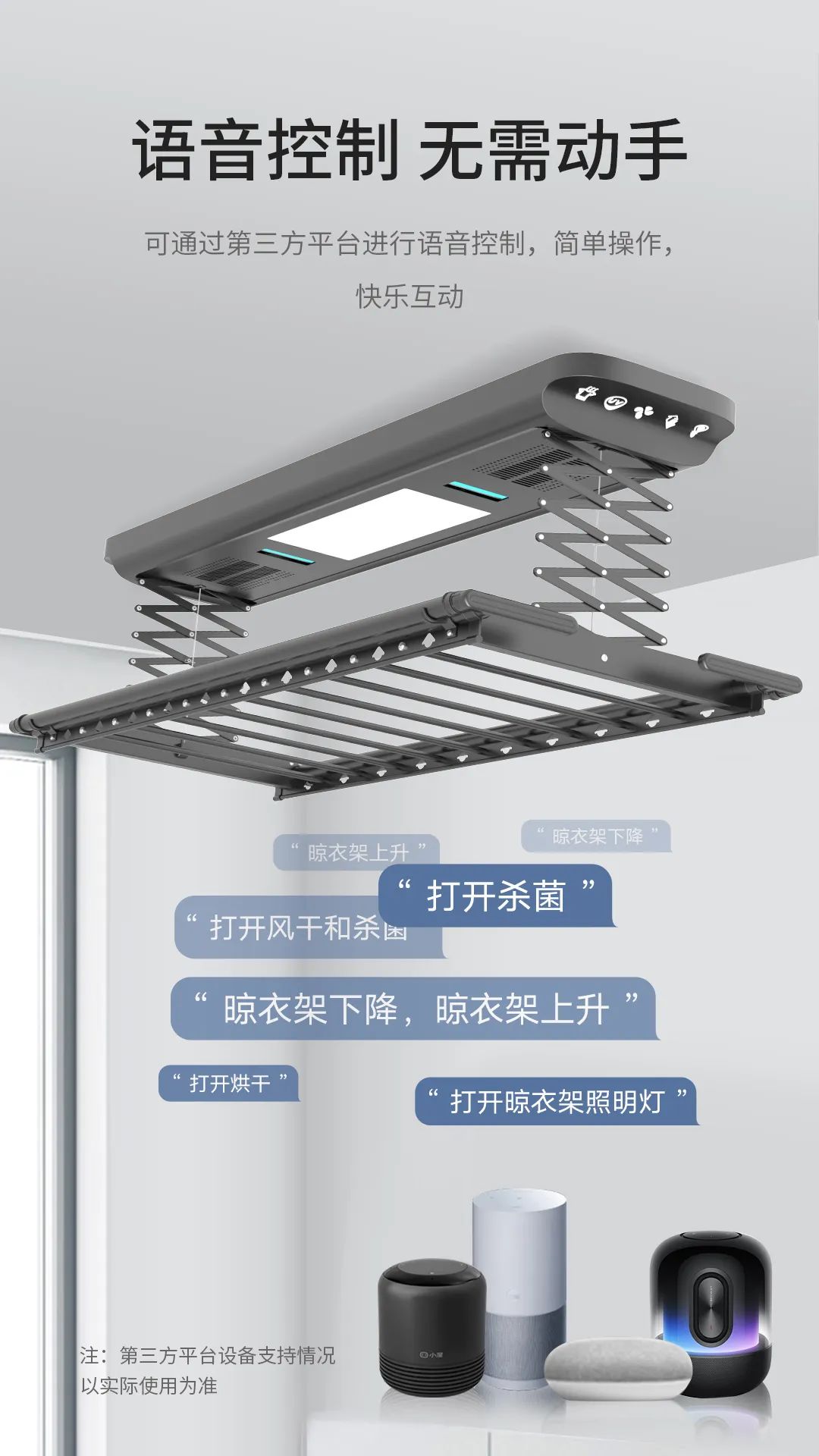不再限制在普通遙控器上,智匯云智能晾衣架不僅可以通過(guò)智能家居管家APP,用手機(jī)隨心操控;還能通過(guò)“云云對(duì)接”實(shí)現(xiàn)語(yǔ)音控制功能,用戶(hù)連接小愛(ài)同學(xué)或者天貓精靈等第三方平臺(tái),升降、照明、烘干、風(fēng)干、UV殺菌,只需要一句話,就能輕松控制,讓晾曬更方便。