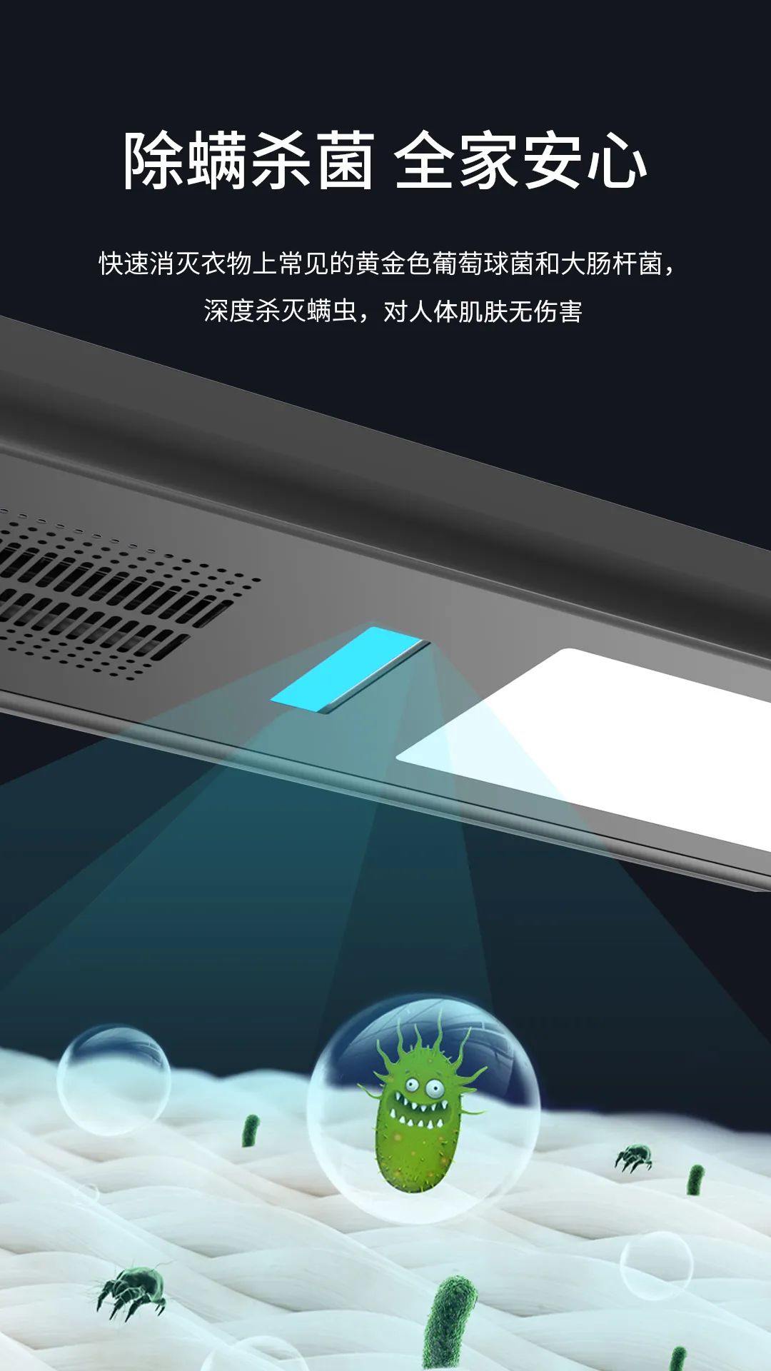 將照明面板和紫外線燈巧妙結(jié)合,大大擴(kuò)寬殺菌光線的覆蓋范圍。在烘干衣物的同時(shí),還能通過(guò)UV紫外線燈對(duì)衣物進(jìn)行深層次消毒殺菌除螨,深層潔凈衣物,呵護(hù)家人健康。