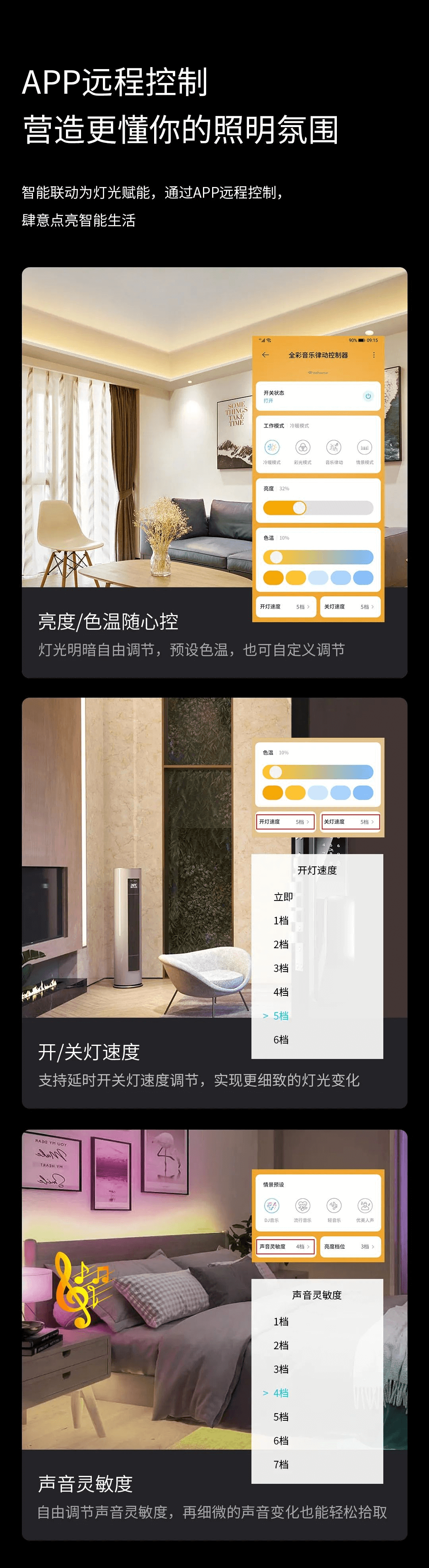區(qū)別于市面上大部分通過手機話筒拾音的調光控制器,控制器內置微型麥克風拾音,精準識別音樂的變化而發(fā)出指令,使燈帶隨著音樂的律動變換色彩。