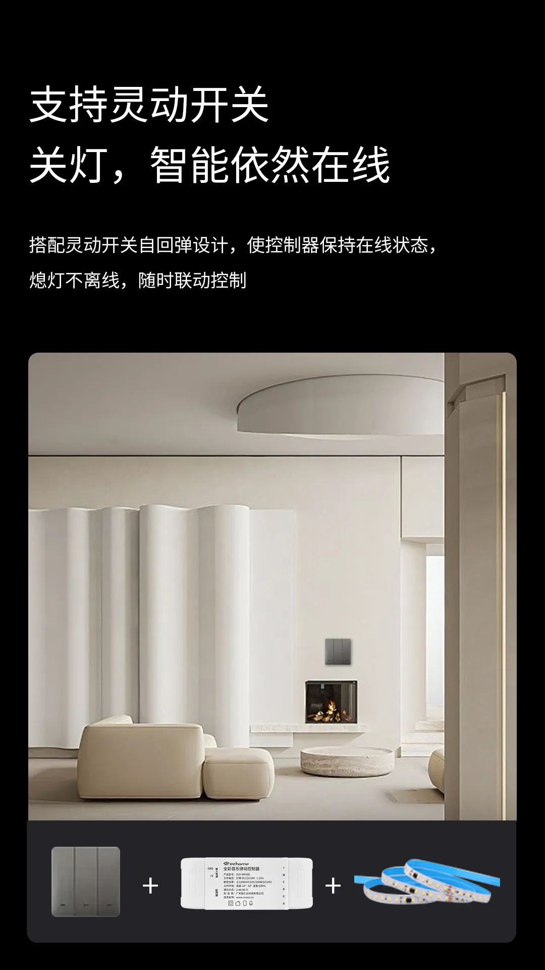 該控制器支持搭配靈動開關使用,關燈不會令設備斷電離線,時刻保持聯網響應。