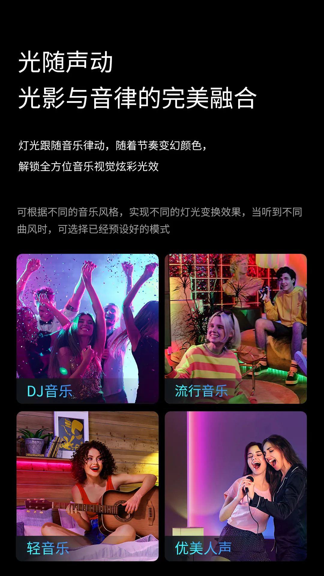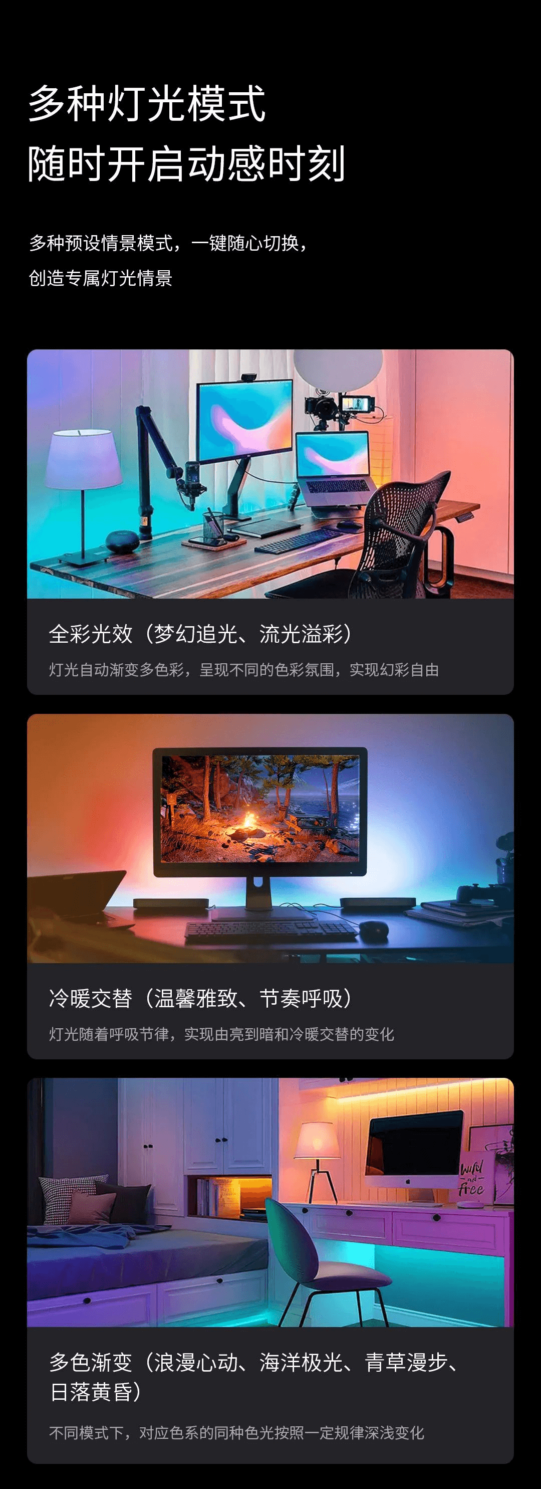 除了音樂律動、冷暖模式、彩光模式三種功能模式,新品還加入了多種預設情景模式,讓燈光讀懂你的心情。