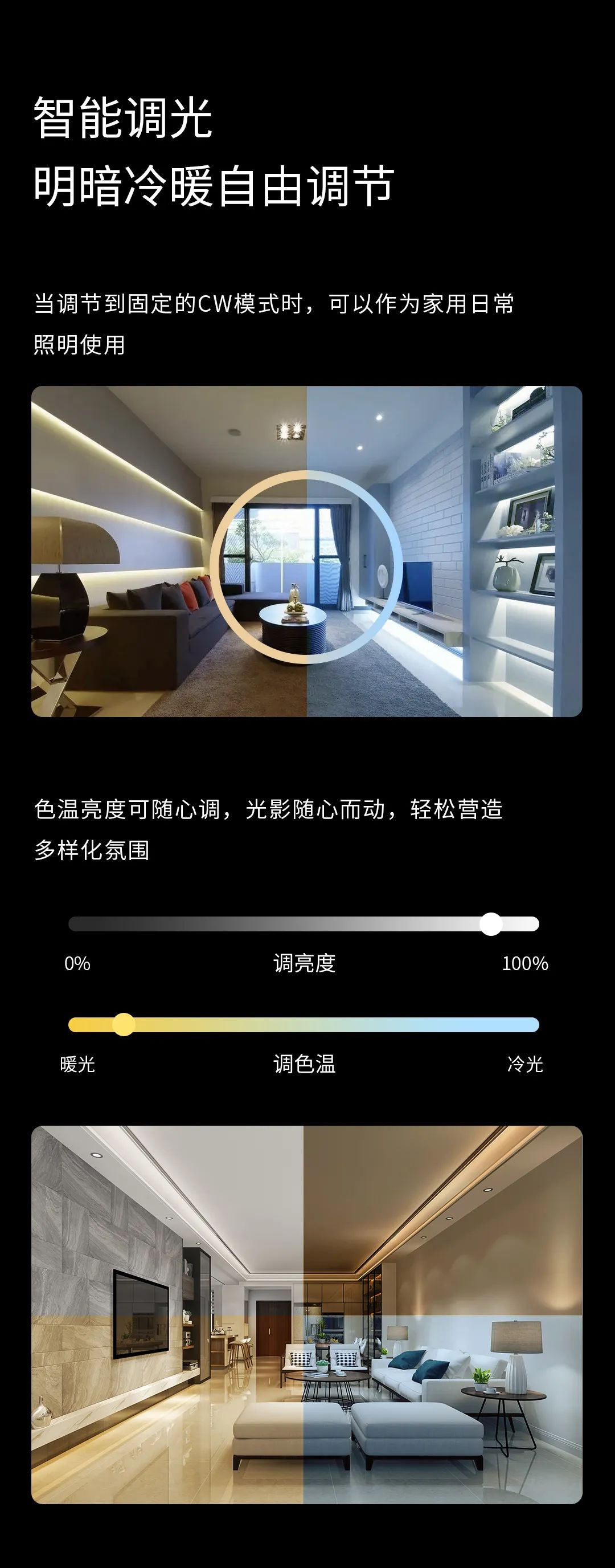 當切換到冷暖模式時,用戶可以對燈光的亮度和色溫進行精確的自由調節(jié)。從落日余暉到盛夏晴空,根據自己的生活習慣打造個性化燈光場景。