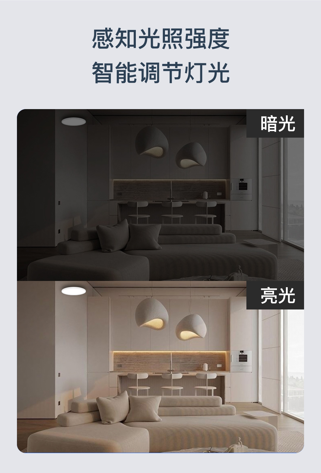精準(zhǔn)感知室內(nèi)光照強(qiáng)度,根據(jù)室內(nèi)光線的明暗程度聯(lián)動(dòng)燈光自動(dòng)調(diào)節(jié)亮度、開關(guān),滿足用戶不同時(shí)段所需。