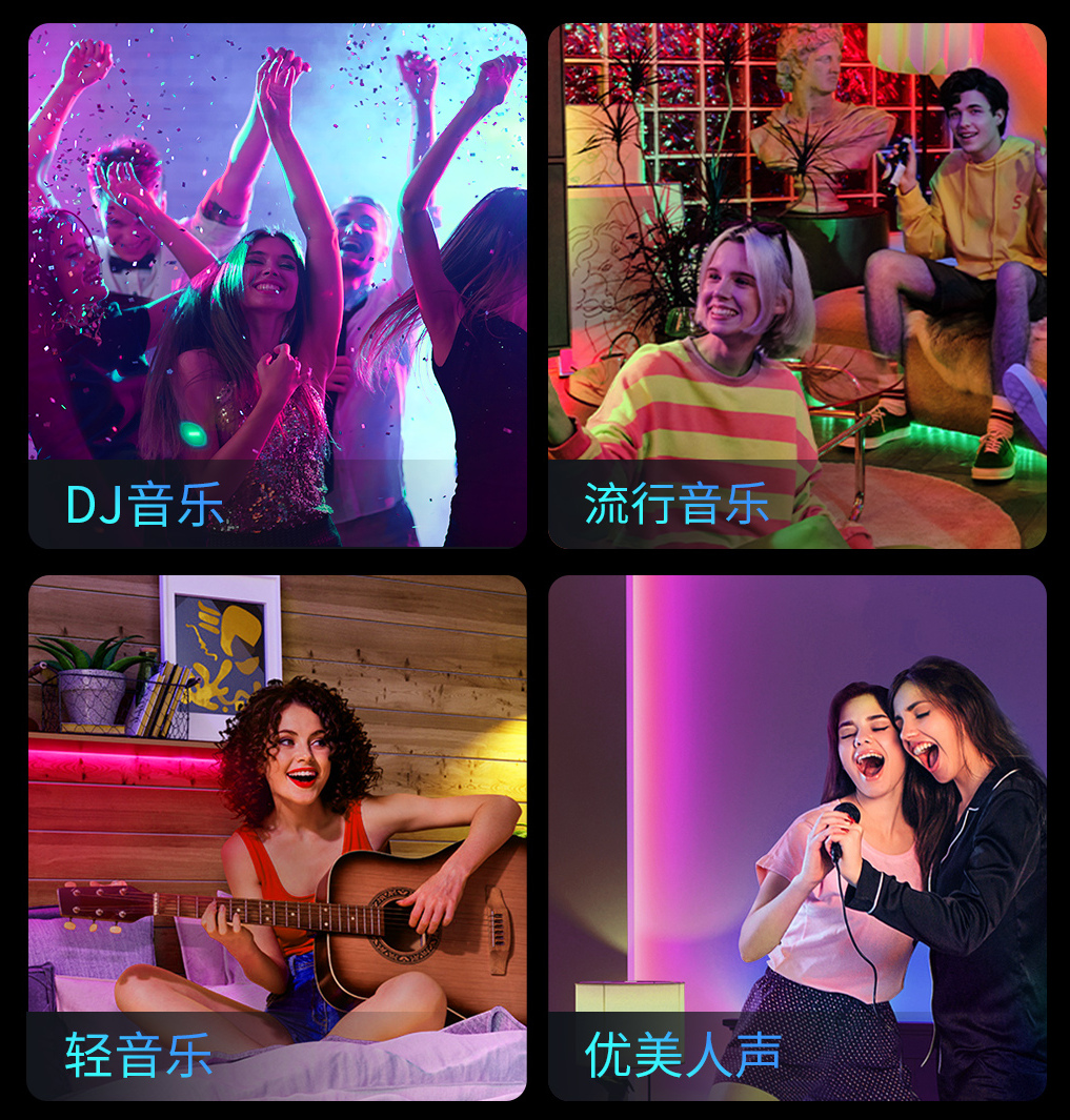 可以讓燈光跟隨音樂節(jié)奏律動變化,不斷切換燈效,發(fā)生顏色以及亮度上的變化。聲光同步,不斷跳躍,好的音樂和歌曲也能夠很好的展現(xiàn)出來,氛圍感直接拉滿。