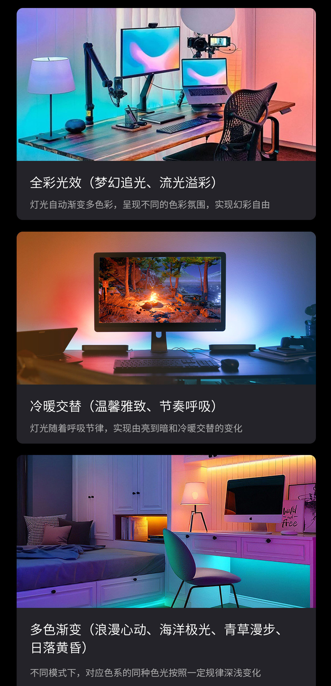 當(dāng)切換為“全彩模式”時(shí),全色域1658萬色隨心調(diào)節(jié),帶給你飽滿、真實(shí)的色彩呈現(xiàn),讓你的家居環(huán)境變得更有格調(diào)。
