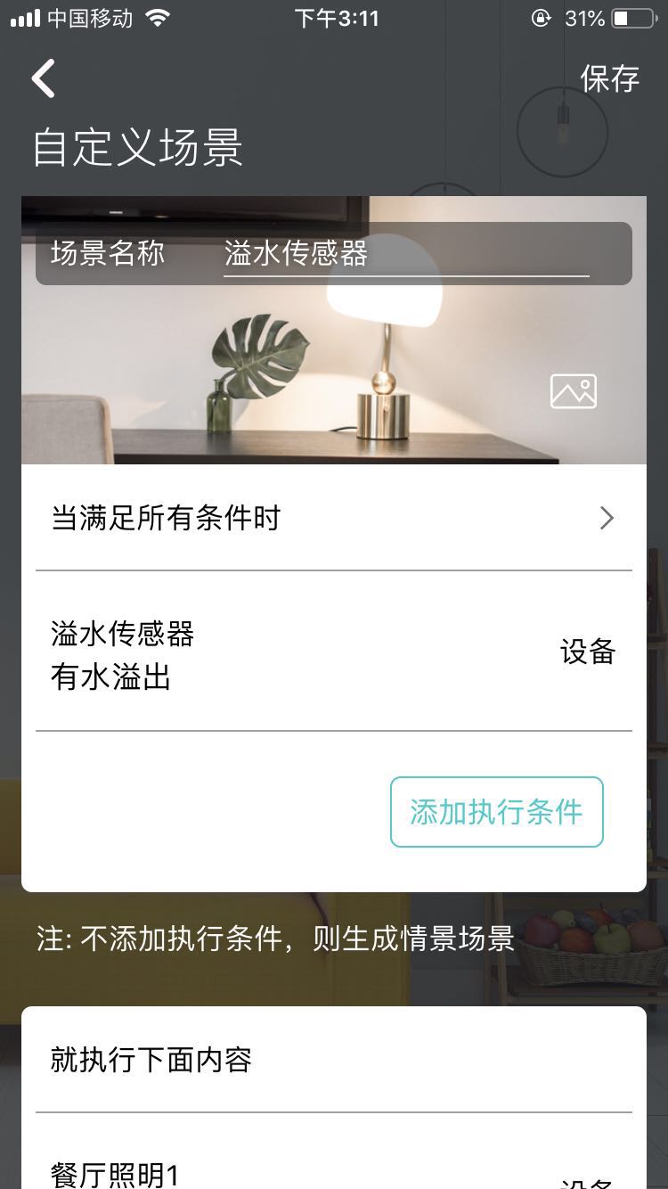 溢水傳感器可以在檢測(cè)到屋內(nèi)水浸時(shí),主動(dòng)推送警報(bào)到手機(jī)APP,并聯(lián)動(dòng)智匯云控制其他智能設(shè)備,及時(shí)關(guān)閉水閥。