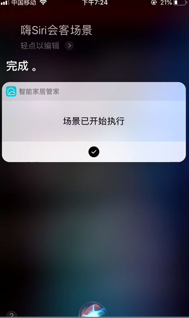 在智匯云APP“智能家居管家”的ios系統(tǒng)版本中,只需在APP上的場景界面錄制Siri語音指令,之后就可以通過喚醒Siri實現(xiàn)場景模式控制,無需通過語控設備來實現(xiàn)語音控制。