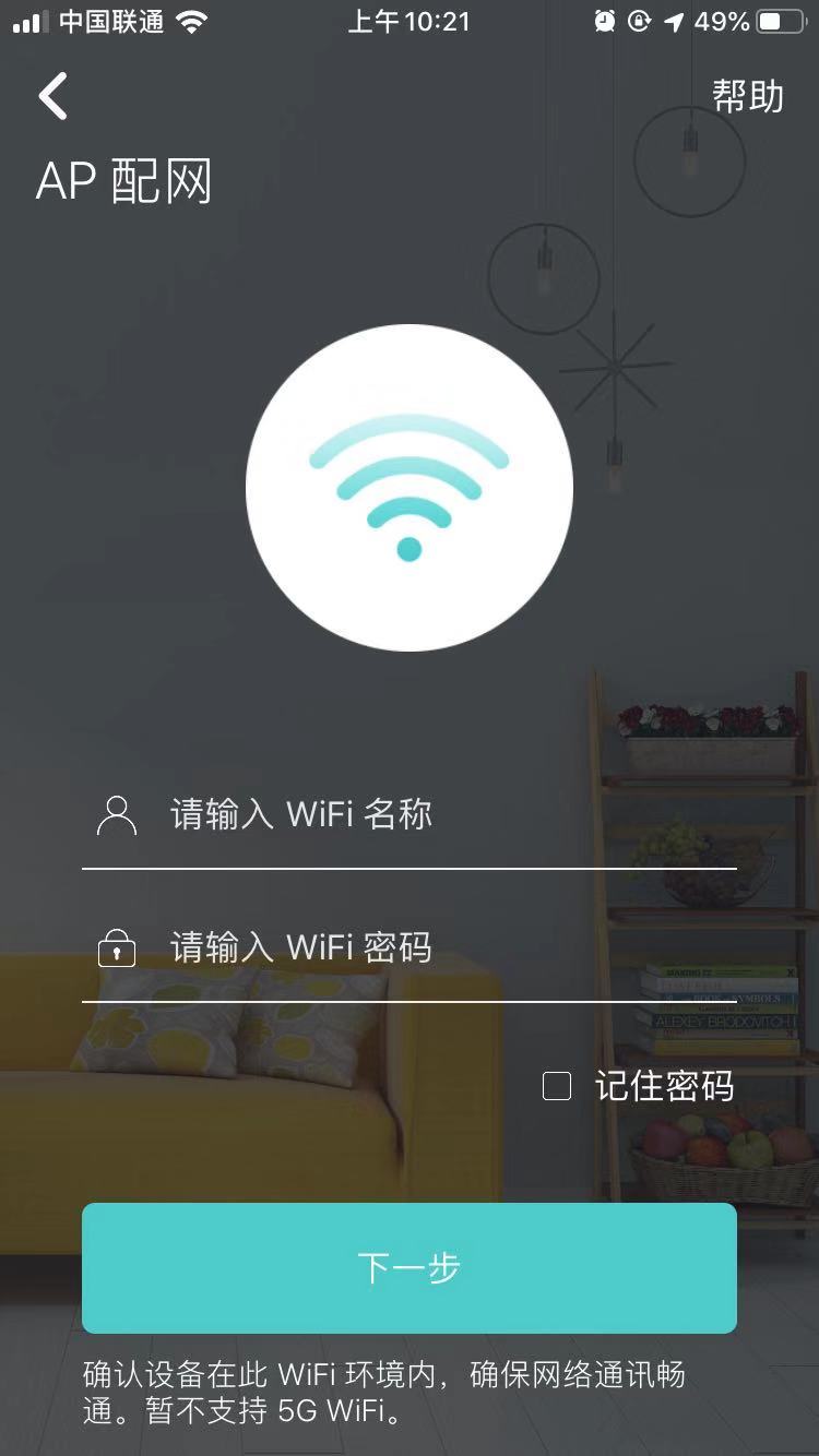 進(jìn)入AP配網(wǎng)界面后,對(duì)應(yīng)輸入所需連接WIFI名稱和密碼;點(diǎn)擊下一步開啟配網(wǎng)模式。(注意:門鎖暫不支持5G頻段WIFI)