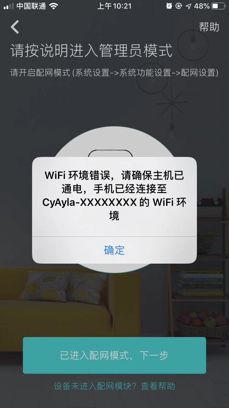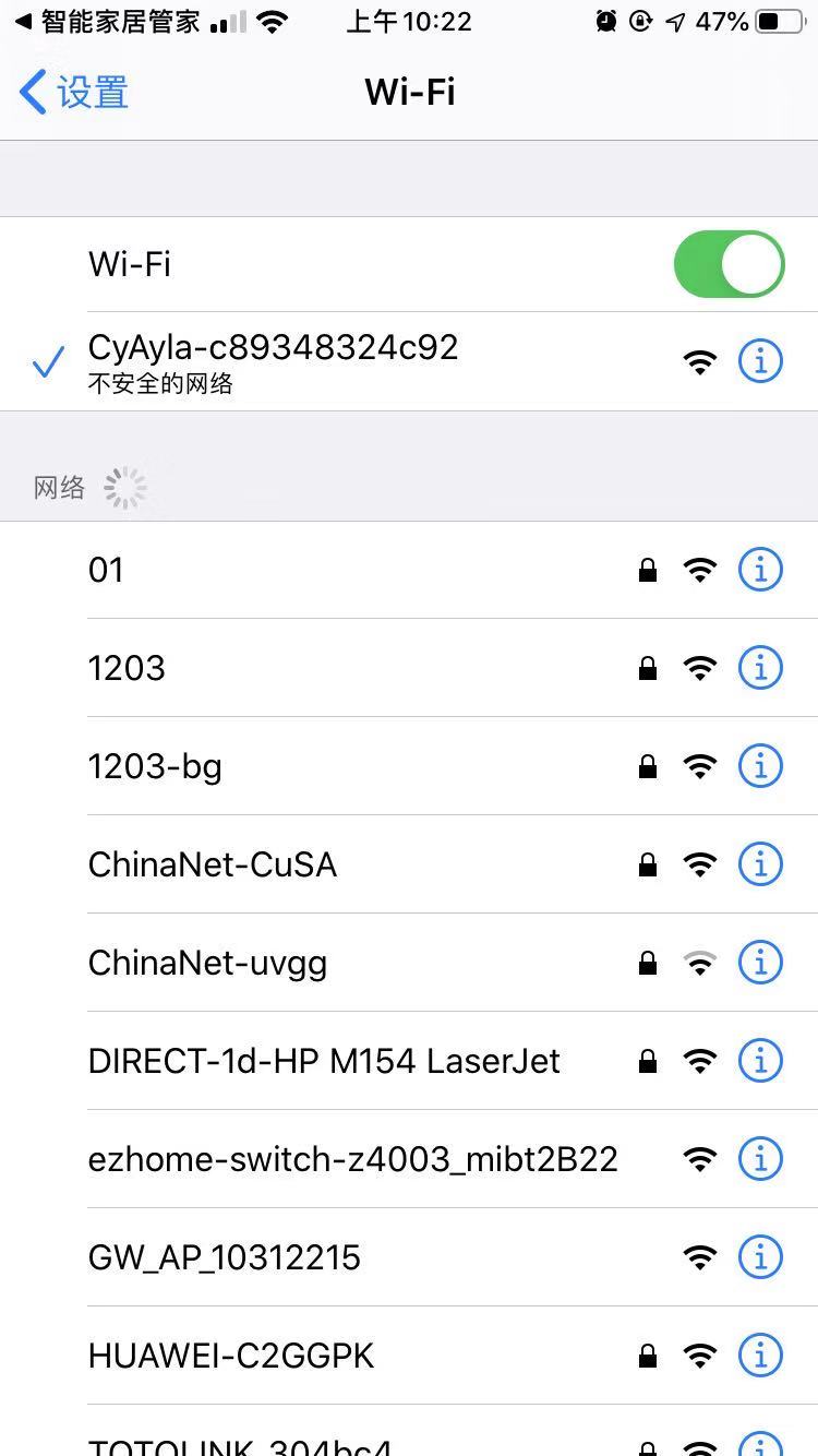 若彈框顯示W(wǎng)IFI環(huán)境錯(cuò)誤消息時(shí),需先確保智能門鎖已在開啟狀態(tài),并將手機(jī)跳轉(zhuǎn)至WIFI選擇界面,選擇對(duì)應(yīng)彈框消息中對(duì)應(yīng)WIFI,即可繼續(xù)進(jìn)行AP配網(wǎng),等待配網(wǎng)完成點(diǎn)擊下一步。