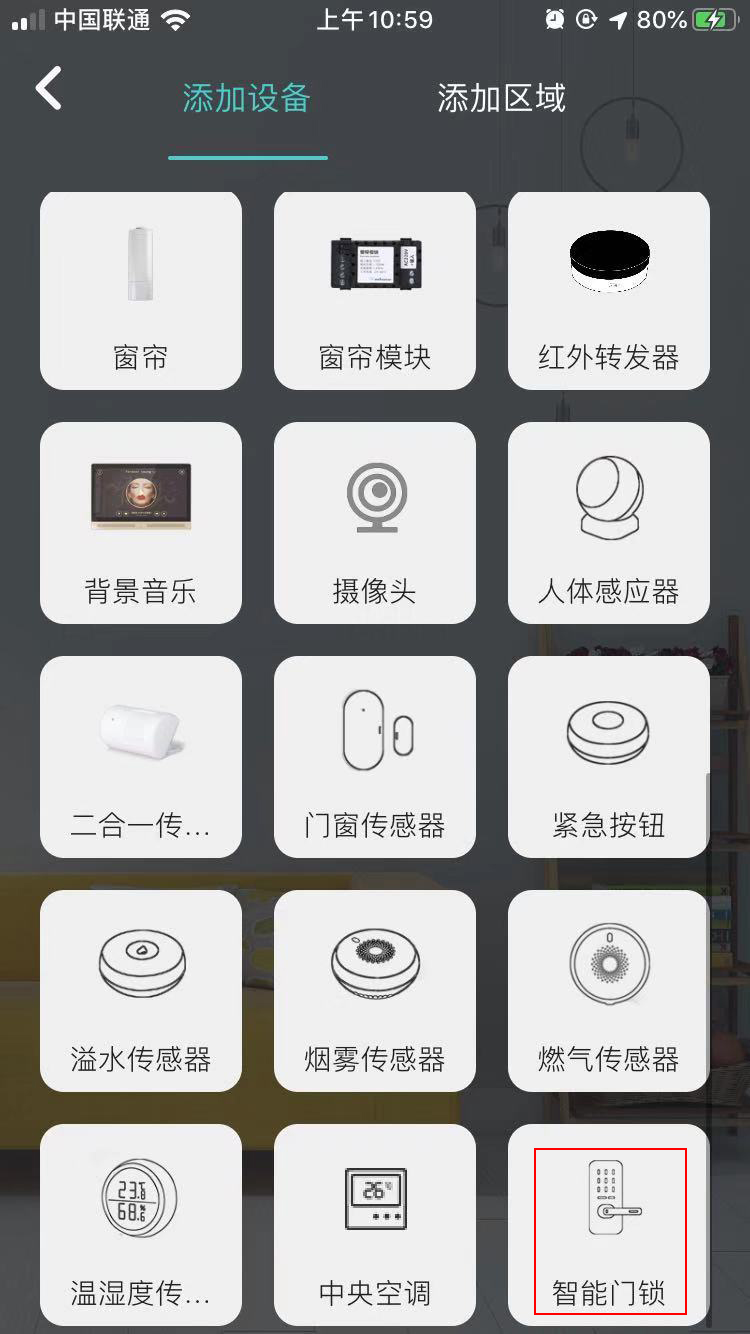 點(diǎn)擊APP下方設(shè)備欄,再點(diǎn)擊右上方“+”鍵,找到并選擇智能門鎖設(shè)備。