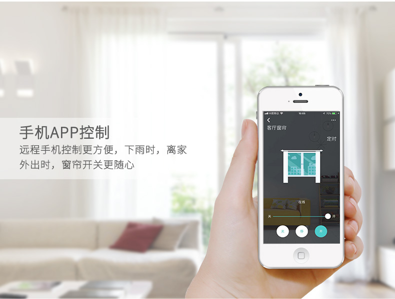 智匯云智能窗簾電機,可以通過手機、遙控器、語音等多種方式進(jìn)行操控,在家中的任何角落都能一鍵開合窗簾,再不用為起身手拉窗簾感到煩惱;當(dāng)然,它也保留了手拉的功能,充分考慮停電時的情況。