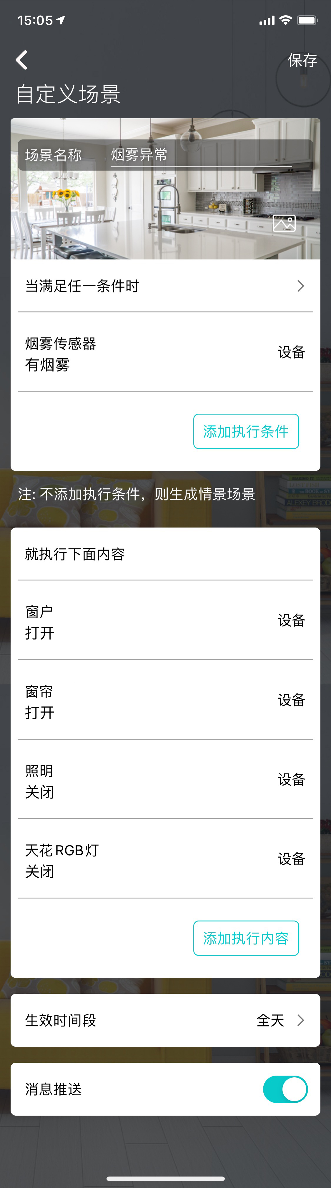 煙霧傳感器可以在感應(yīng)異常煙霧出現(xiàn)時,聯(lián)動讓關(guān)聯(lián)區(qū)域內(nèi)的電器斷電;用戶在收到報警推送后可以及時求助,處理緊急情況。