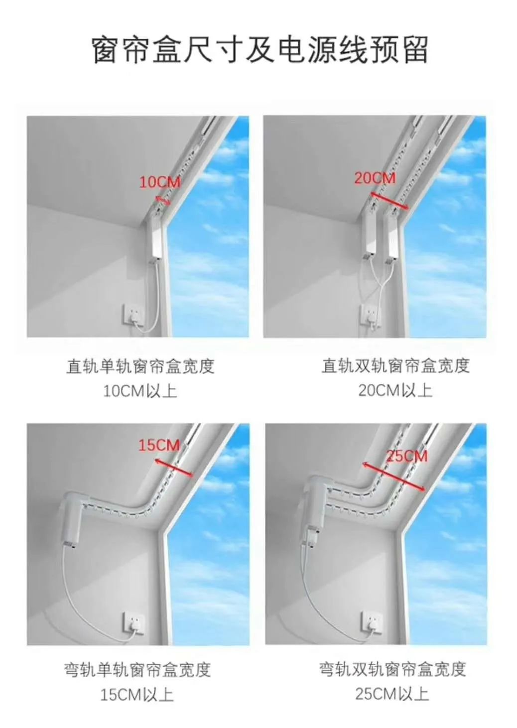 1、單軌電動窗簾,窗簾盒內徑寬度留10CM以上;